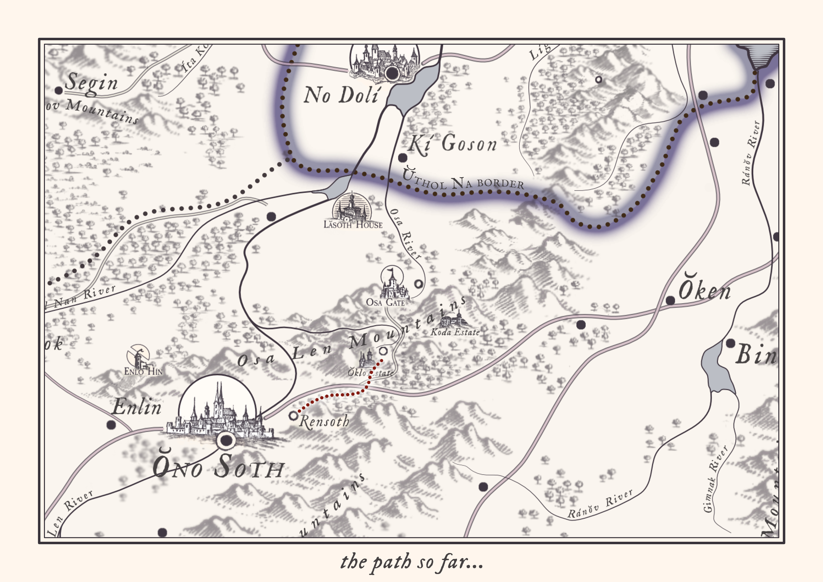 Min La found himself remembering Nŏl and Hino Son. They hadn’t been apart from them for more than two days and already they felt like they were a fragment of another life. At least to Min La. He had had the strange sensation when they had parted that he would never see them again. It made him wonder where this path would lead him after Osa Gate, which was a thought he had not time to think in many days. Nor was it one that he liked remembering. The path they were on was difficult enough; there was no point in making it even more complicated by considering a future of endlessly diverging possibilities.