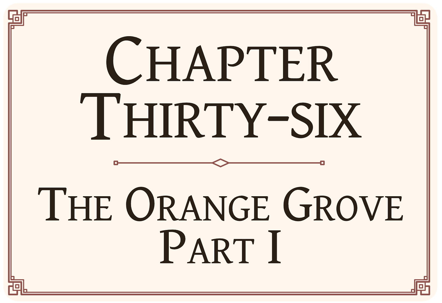 Each tree stood as tall as three men, or taller, their great, wide branches laden with clusters of fruit: shining red oranges as bright as lanterns and as large as cantaloupe. A shimmering shade was produced by the canopy of their outstretched branches. They could walk beneath them without having to bend their necks.